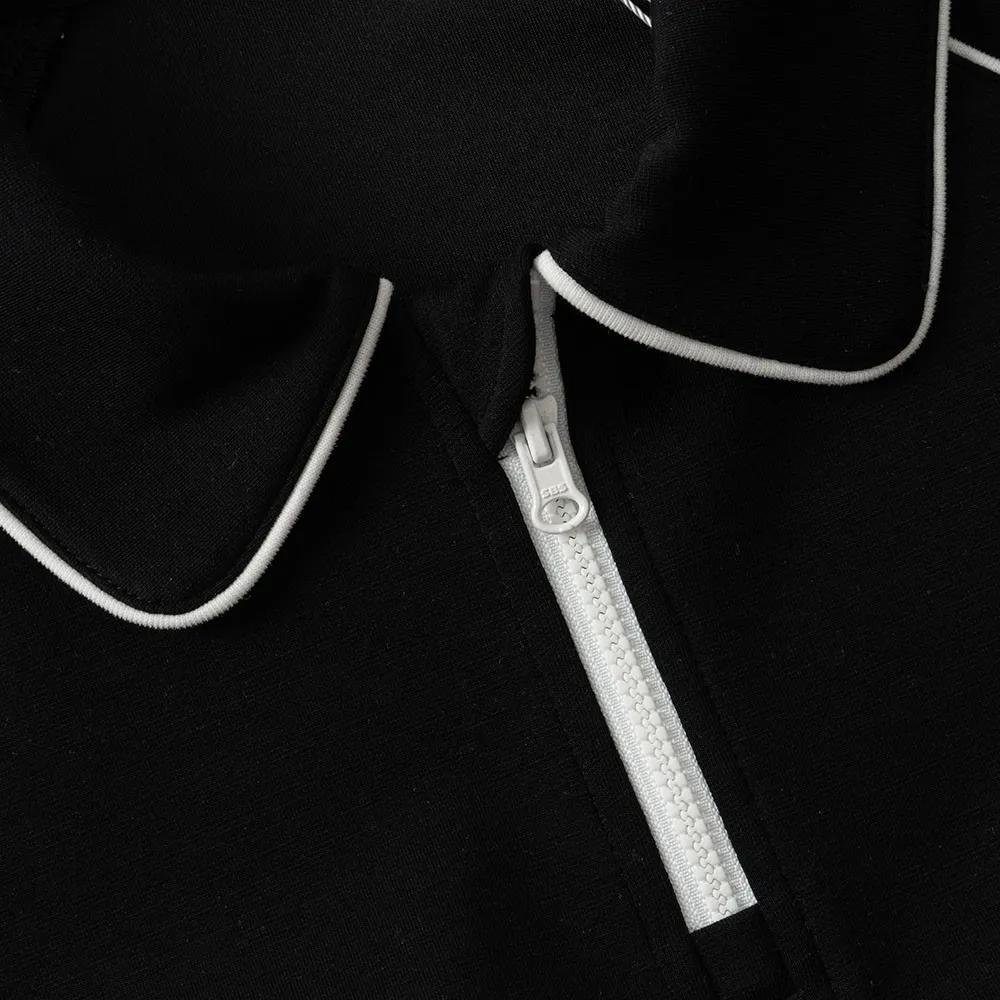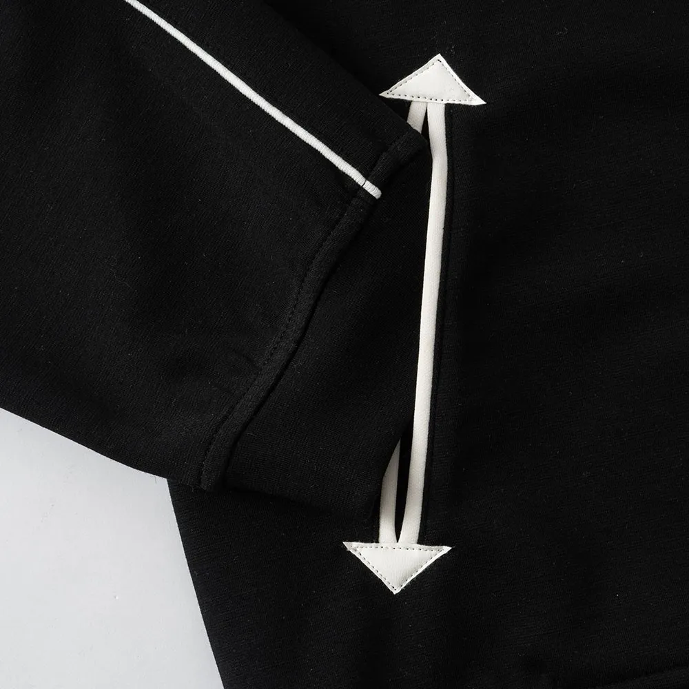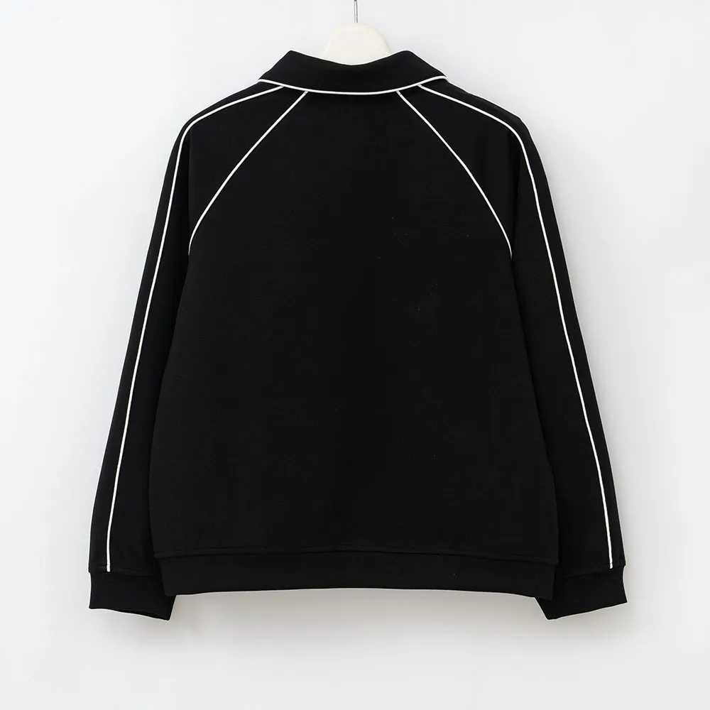 Общий дизайн основан на классическом черном цвете с белыми линиями отделки. Воротник и дизайн полумолнии на горловине сочетают в себе ретро-стиль с легкостью надевания и снимания. Белые линии и стрелочные узоры на плечах, рукавах и карманах перекликаются друг с другом, усиливая визуальную многослойность и добавляя нотку дизайнерской изобретательности. Слегка свободный крой спущенного плеча сохраняет непринужденное ощущение, а также выгодно подчеркивает фигуру.